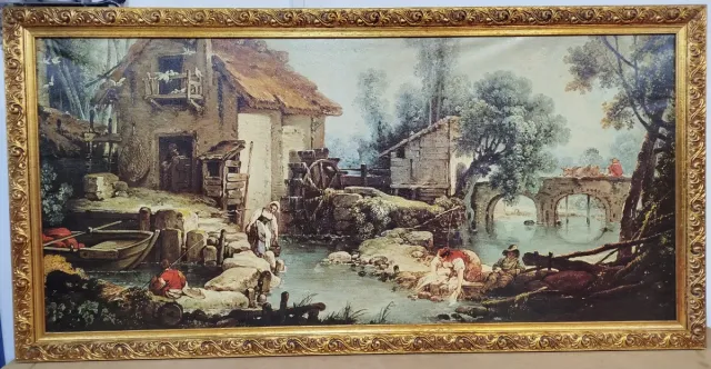 Detalles del productoCuadro decorativo con escena de paisaje rústico. No es al óleo. Marco de madera con pintura dorada y detalles ornamentales.