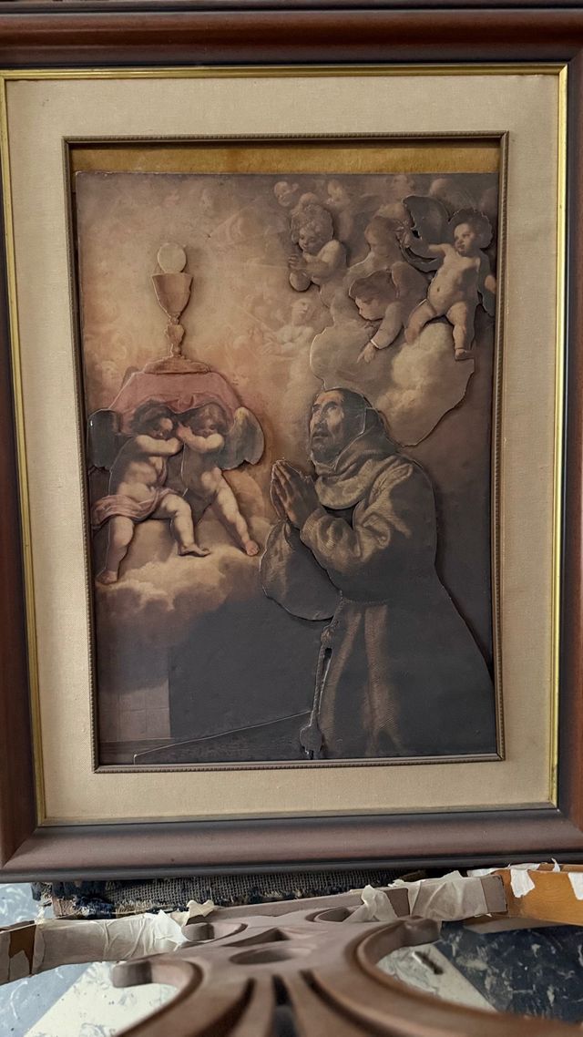 Detalles del productoPrecioso cuadro religioso vintage con efecto relieve tridimensional. Representa a un santo franciscano en oración ante la Eucaristía, rodeado de ángeles, con gran detalle y profundidad en las figuras.