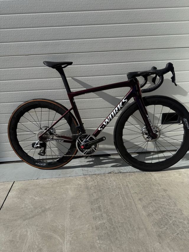 • Cuadro: S-Works Tarmac SL8, color berenjena con efecto cambiante según la luz