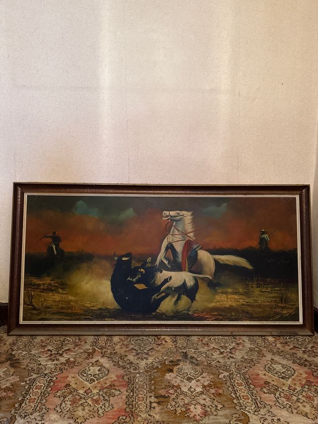 Detalles del productoEspectacular cuadro vintage que representa una escena de rodeo. Pintado con gran detalle y colorido. Ideal para decorar un espacio con estilo rústico o western.