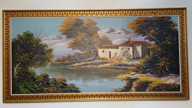 Detalles del productoPrecioso cuadro vintage que representa un paisaje sereno con un lago y una casa.