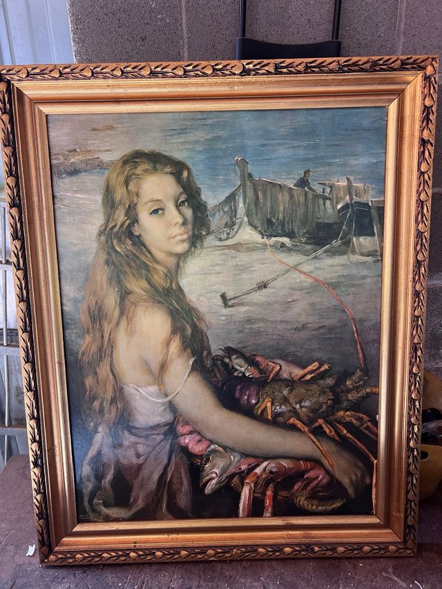 Pintura al óleo de Francisco Ribera. - Escena marina con figura femenina y mariscos. - Marco dorado con detalles tallados.