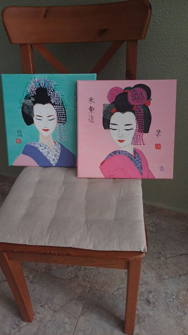 Detalles del productoDos lienzos pintados a mano en óptimas condiciones. Representan dos geishas en diferentes posiciones y diferentes colores. Son cuadrados y mide cada uno, 32,5×32,5cm.