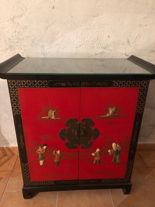 Precioso cubertero chino antiguo, traido de Hong Kong en la epoca de los 70. Está hecho de madera lacada en rojo, con detalles en negro y dorado. Tiene dos puertas con bisagras y un tirador metálico. Las puertas presentan bonitas pinturas de escenas orientales con incrustaciones de marfil o hueso. La tapa es de cristal. Ideal para decorar tu hogar con un toque oriental.
