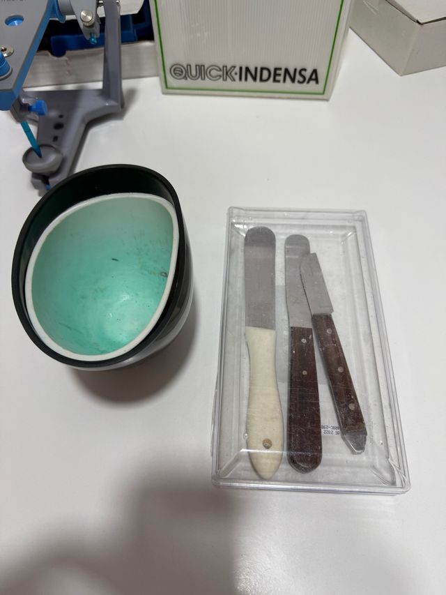 Detalles del productoLote de material dental que incluye cubetas Rim Lock, una pistola automix, taza de alginato y escayola y las espátulas.