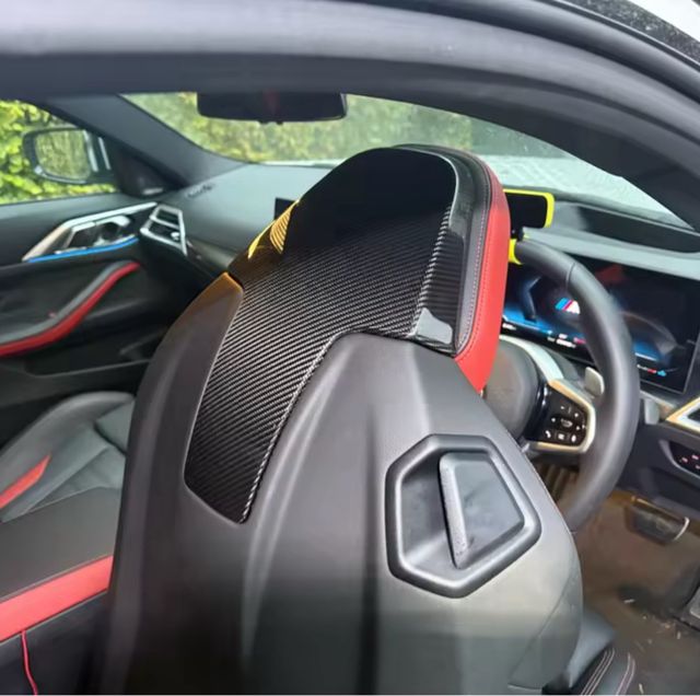 Detalles del productoCubierta trasera para asiento de BMW con acabado en fibra de carbono.