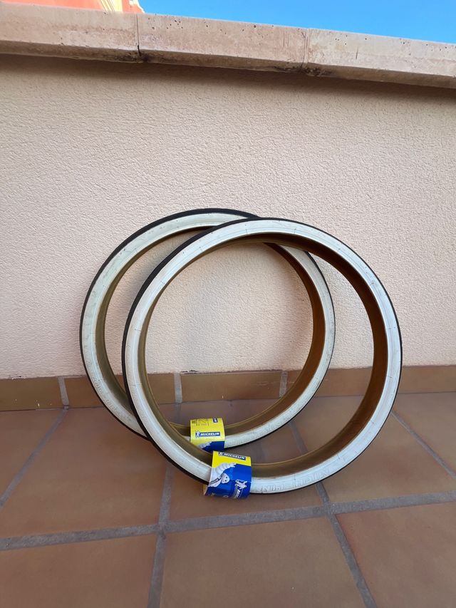 Dos cubiertas Michelin nuevas, listas para montar. - Color blanco con banda lateral. - Incluyen embalaje original.