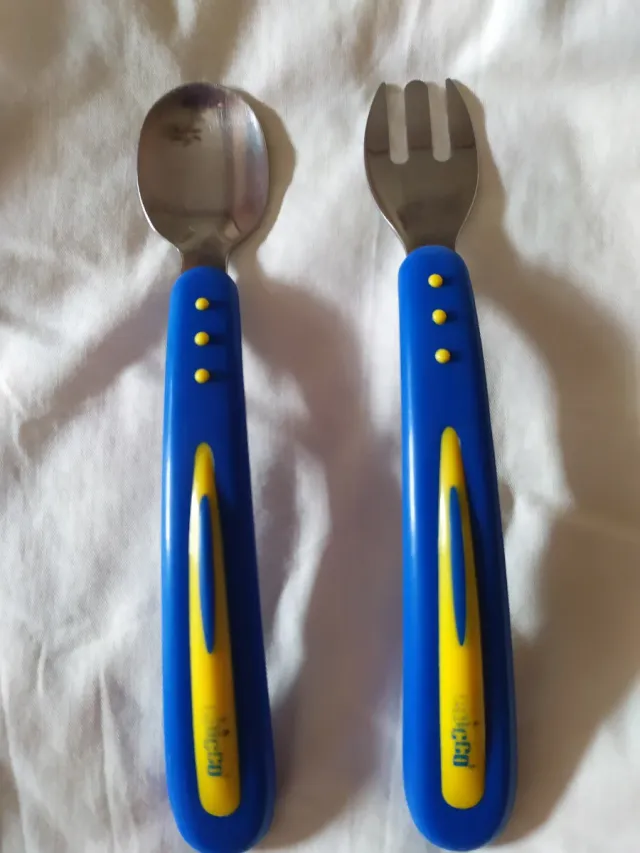 Detalles del productoSet de cubiertos infantiles de la marca Chicco, ideales para los más pequeños. El set incluye un tenedor y una cuchara. En buen Estado, salvo las letras que se han borrado un poco al esterilizarlos tras su uso.