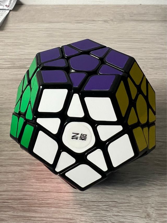 Rompecabezas tipo cubo de Rubik con forma de dodecaedro. Presenta un diseño con piezas de colores.