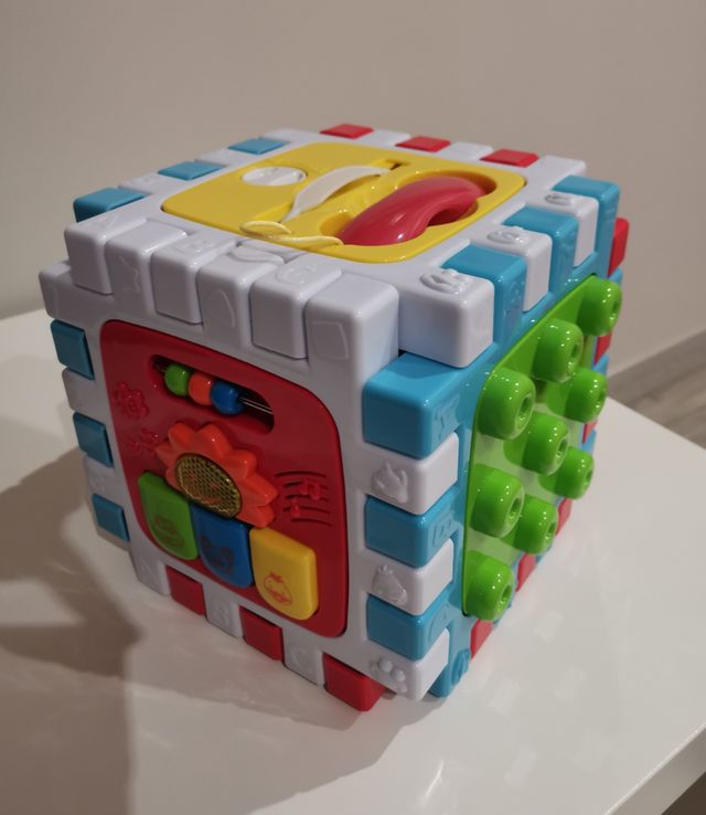 Es un cubo interactivo con varios juegos, muy entrenenido. Le falta una pieza, un cuadrado amarillo que le gustó a uno de nuestros perros...
