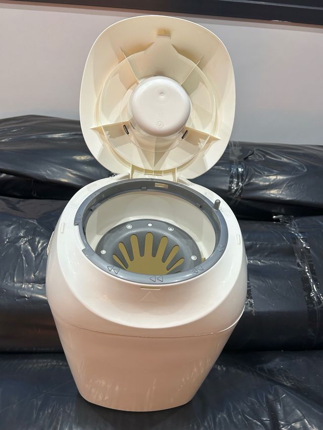 Contenedor para desechar pañales de forma higiénica. Su diseño es práctico y discreto. - Color blanco. - Tapa abatible.