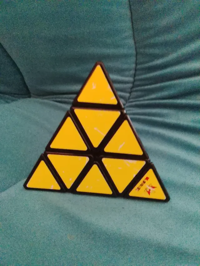 Cubo Rubik con forma de pirámide y pegatinas amarillas. - Diseño triangular. - Color principal: amarillo. - Marco negro.