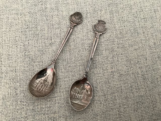 Detalles del productoConjunto de dos cucharas de recuerdo de Hertogenbosch. Cada cuchara presenta un diseño detallado.