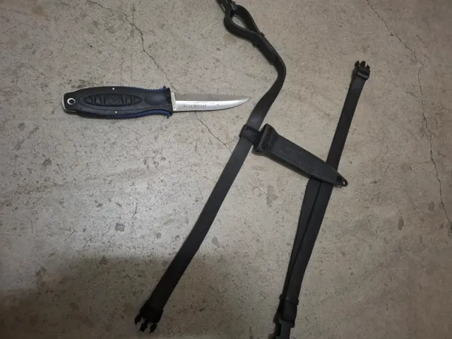 Detalles del productoCuchillo de buceo Aqualung con funda y correas.