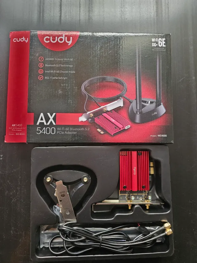 Detalles del productoVendo esta avanzada tarjeta de red PCIe Cudy AX5400 (Modelo WE4000) Wi-Fi 6E. Está en estado como nueva, completa con todos sus accesorios (antenas, soportes, cables) y en su caja original.