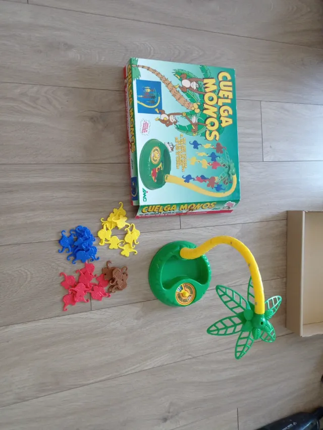 Detalles del productoJuego de mesa Cuelga Monos de IMC. Incluye varias piezas de monos de colores y la estructura del juego.