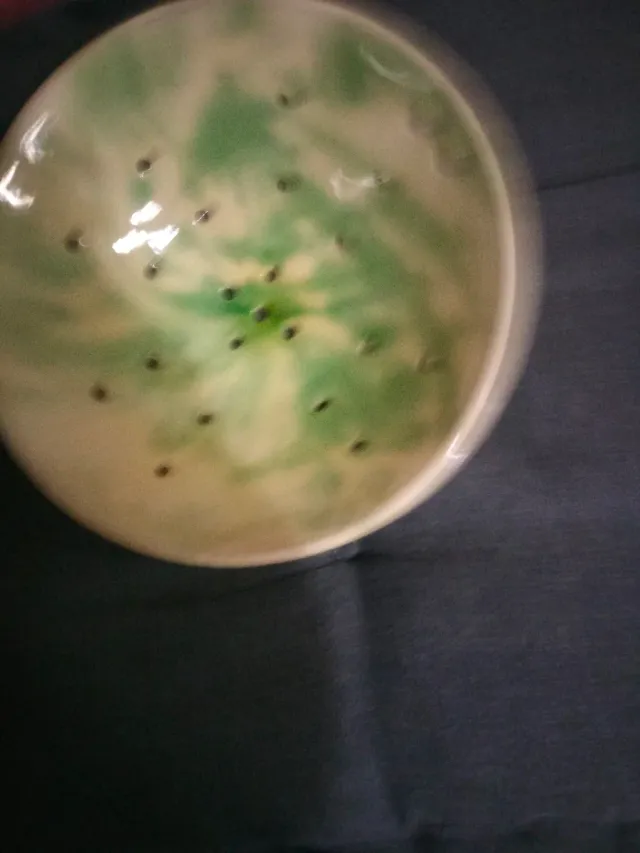Detalles del productoAntiguo cuenco de cerámica con un diseño marmoleado en tonos verdes y blancos. Presenta pequeños orificios distribuidos por su interior.medidas 25cm