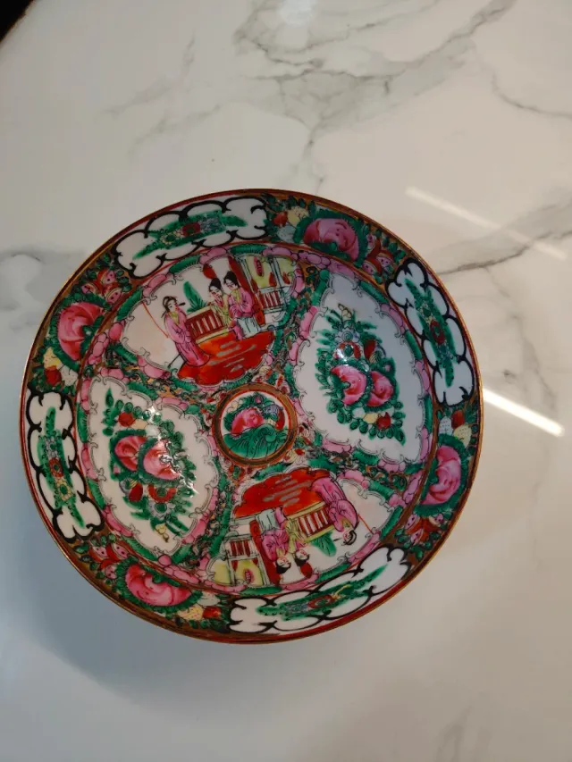 Detalles del productoPrecioso cuenco chino con un diseño tradicional de Macao. Presenta escenas y motivos florales coloridos.
