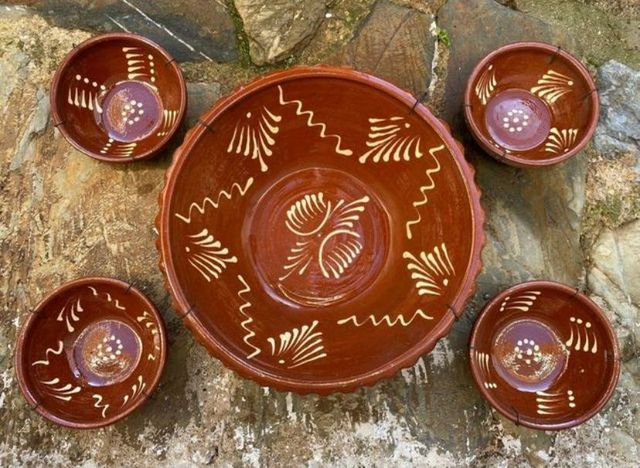 Juego de 5 cuencos de barro antiguos, pintados a mano, en perfectas condiciones, están preparados para colgarlos.