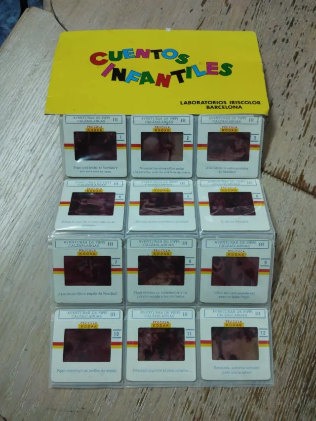 Detalles del productoColección de diapositivas de Aventuras de Pippi Calzaslargas de Iriscolor. Incluye 12 diapositivas.Cada diapositiva tiene una breve descripción.Película Kodak.Entrega en mano
