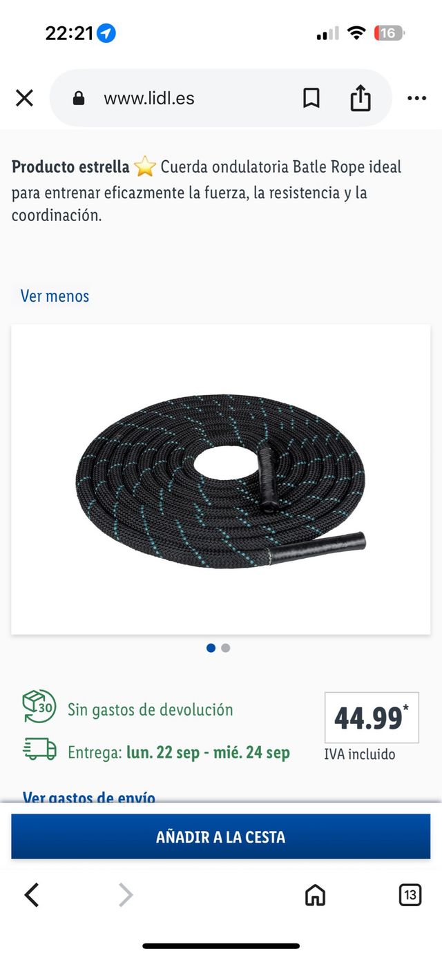 Detalles del productoCuerda de entreno tipo Battle Rope, ideal para mejorar la fuerza, resistencia y coordinación.