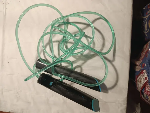 Cuerda de saltar de la marca Decathlon, ideal para entrenamientos. - Diseño ligero y resistente. - Empuñaduras ergonómicas para un mejor agarre.