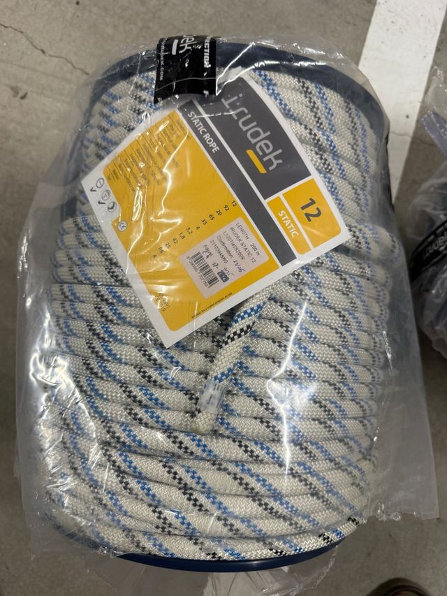 Cuerda estática de la marca Irudek, modelo Static 12. - Longitud: 200 metros. - Diámetro: 12 mm. - Color: Blanco con detalles azules y negros.