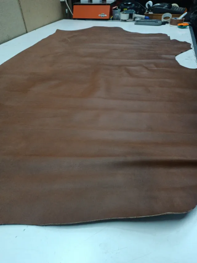 Pieza de cuero marrón con acabado envejecido. - Material: Cuero genuino. - Color: Marrón. - Textura: Acabado envejecido.