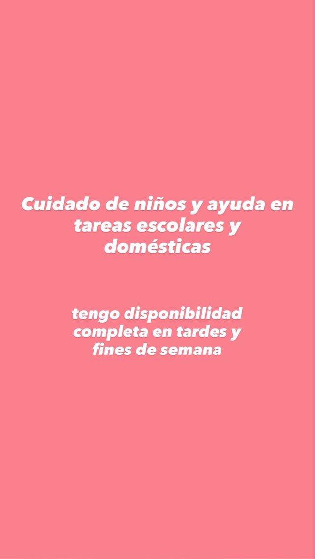 Detalles del productohola me llamo leire tengo 19 años y resido en alcobendas , tengo experiencia en el cuidado y trato con niños ya que me encantan soy muy extrovertida , responsable y resolutiva , puedo ayudarlos con las tareas del cole o tareas domésticas