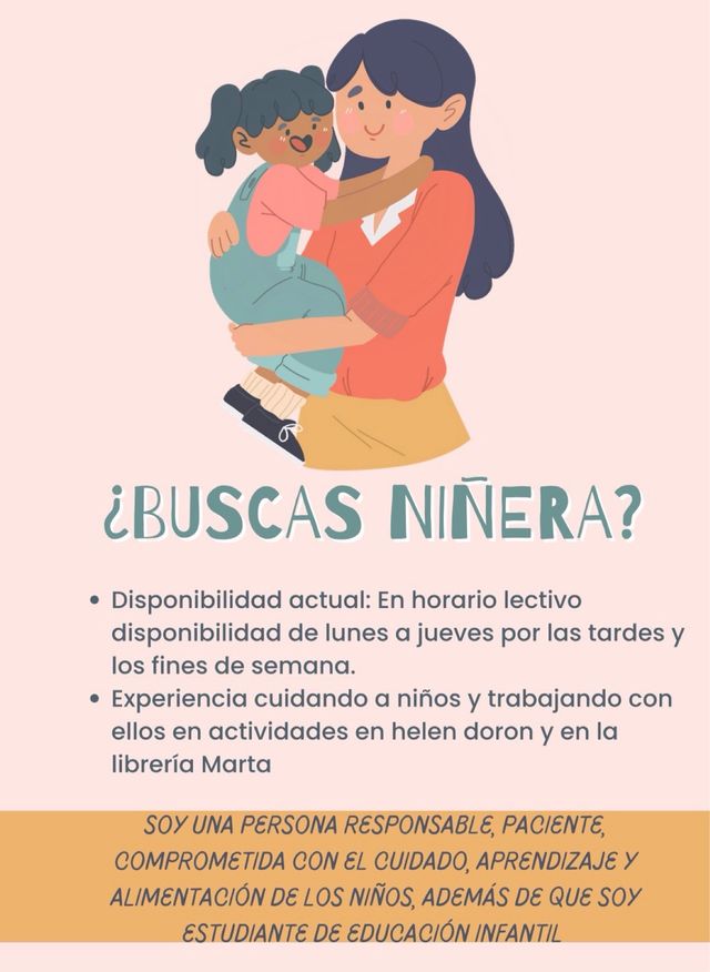 Detalles del productoSoy una estudiante de magisterio de educación infantil, con experiencia cuidando otros niños durante dos veranos de 6 y 8 años, además también he trabajado en actividades con niños en la academia de Helen Doron English con niños de entre 2 y 9 años y en la librería de Mareta.