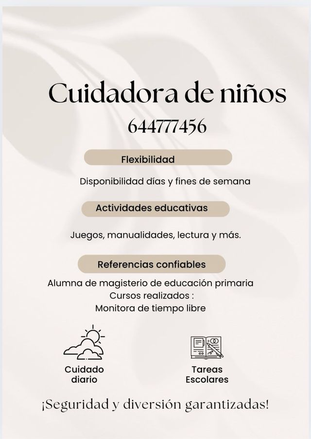 Detalles del productoBusco trabajo como cuidadora de niños. Ofrezco flexibilidad horaria, incluyendo días y fines de semana. Me encantan las actividades educativas como juegos, manualidades y lectura. Tengo referencias confiables, soy alumna de magisterio de educación primaria y monitora de tiempo libre. Aseguro cuidado diario y ayuda con las tareas escolares.