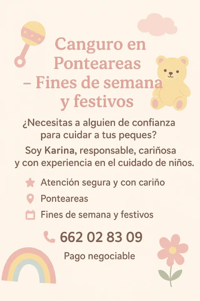 Detalles del productoSi, sos de Ponteareas o alrrededores, ya no tenes que preocuparte por el cuidado de lo más importante de tu vida que son tus peques, como madre de 2 se lo que es dejar al cuidado de otros, por eso pienso dar lo mejor de mi para para que se sientan seguros y felices.