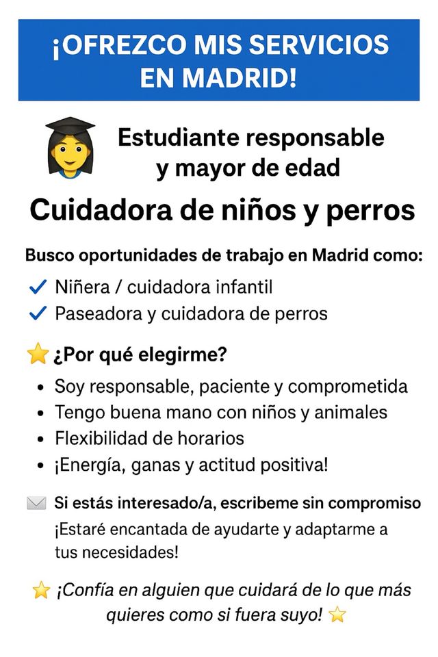 Soy estudiante, responsable y con muy buena mano para niños y perros. Ofrezco cuidados con cariño, paciencia y profesionalismo. Trabajadora, puntual y con horarios flexibles.