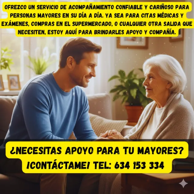Ofrezco un servicio de acompañamiento confiable y cariñoso para personas mayores en su día a día. Ya sea para citas médicas y exámenes, compras en el supermercado, o cualquier otra salida que necesiten, estoy aquí para brindarles apoyo y compañía.