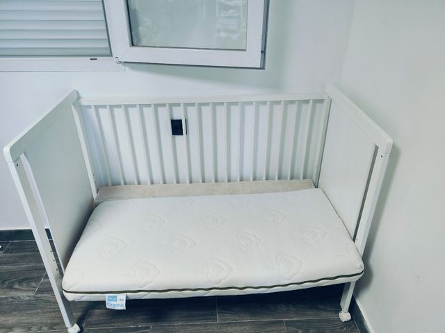 Cuna de color blanco,le faltan dos tornillos que los venden en Amazon ...yo la usaba como colecho colchón no incluido