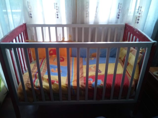 Cuna de 120cmx60cm, 2 alturas regulables y lateral con opción de bajar y subir. Colchón incluido con algunas sábanas, fundas de edredón y protectores.