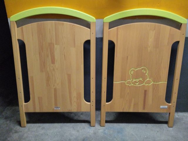 Detalles del productoCuna color madera y detalles en verde. La altura de la cuna y de la barrera es regulable. Se incluye colchón.