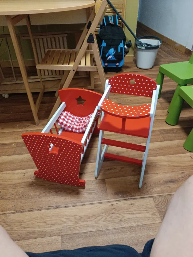 Conjunto de cuna balancín y trona para muñecas, a juego. - Diseño en color rojo con lunares blancos. - Cuna con forma de balancín. - Trona con asiento y respaldo.