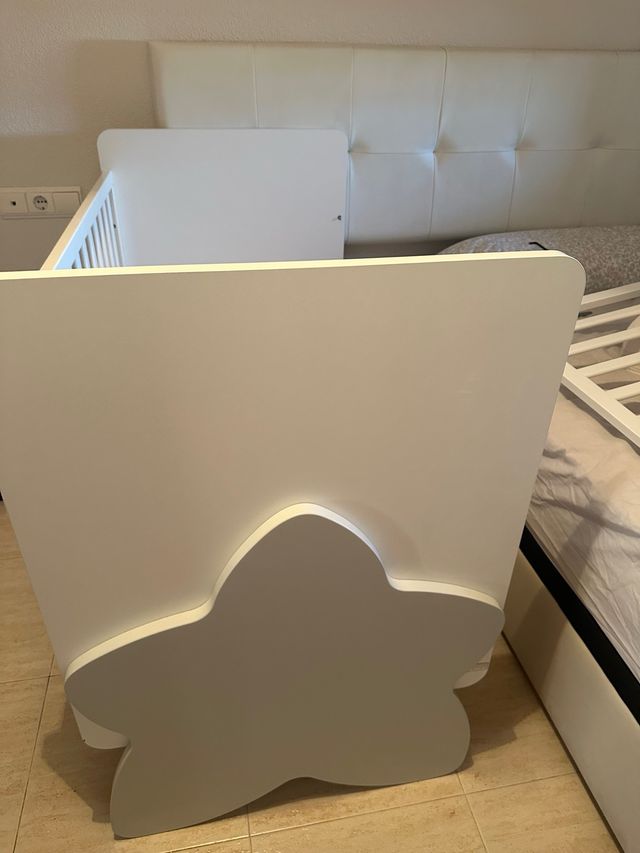 Detalles del productoCuna para bebé de madera, color blanco, en perfecto estado. Tiene una forma de estrella en la base.