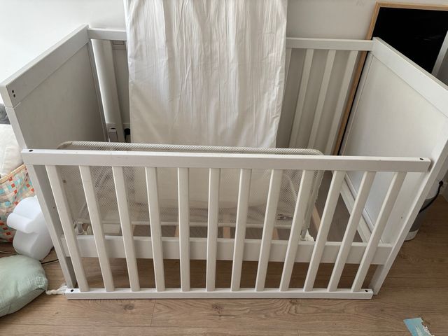 - Cuna de madera blanca Sundvik (120 x 60 cm) en buen estado y DESMONTADA (con todas las piezas y tornilleria). Cuba de evolución con dos alturas y convertible en cama.