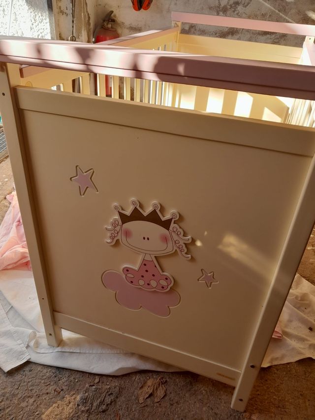 Detalles del productoCuna de bebé en color beige y rosa pastel. Está en buen estado, aunque tiene algunas marcas de uso.