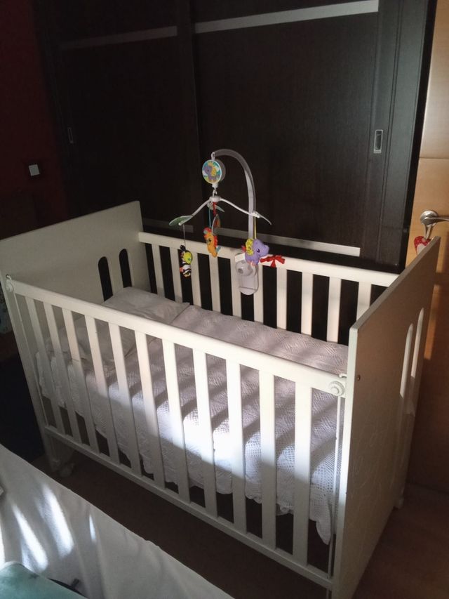 Detalles del productoCuna de bebé en color blanco, ideal para el descanso del recién nacido. Incluye un móvil con figuras.