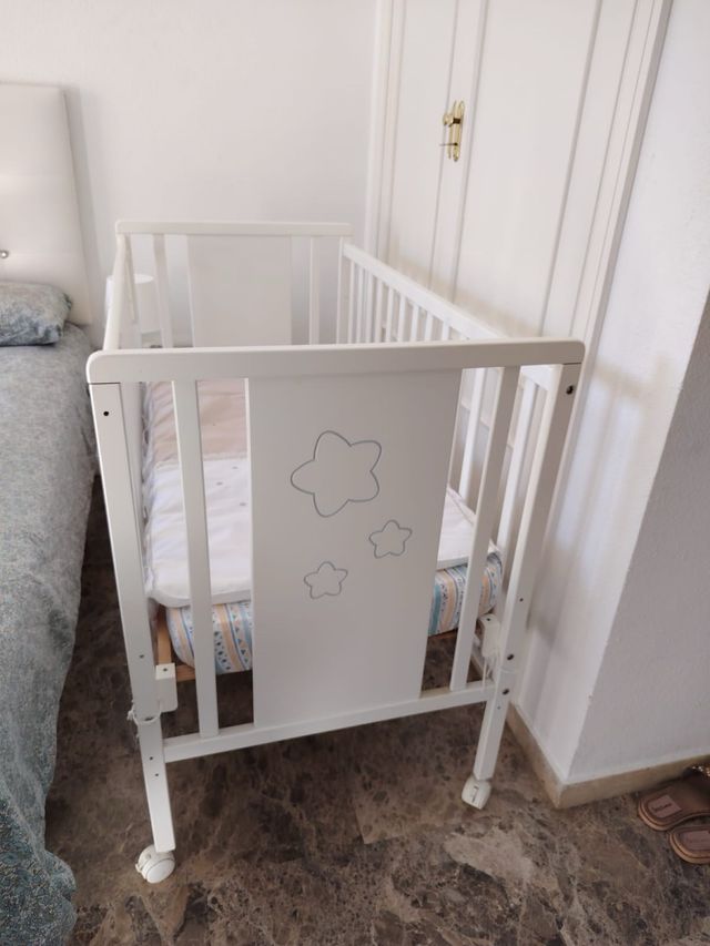 Se vende cuna blanca en buen estado, ideal para bebés. Incluye colchón. - Diseño de estrellas en el lateral. - Ruedas para facilitar el movimiento.