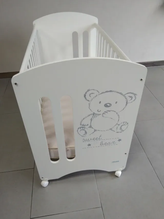 Detalles del productoCuna de bebé en color blanco con un tierno diseño de osito.