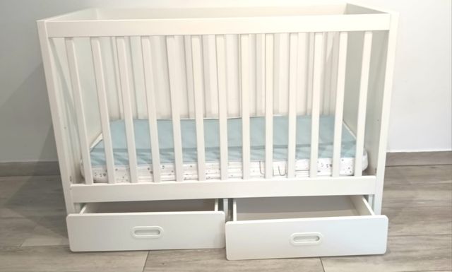 Cuna blanca de madera. Medidas 120x60 cm con dos cajones. incluye colchón con funda. En buen estado.