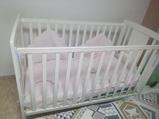 Cuna de bebé en color blanco, con un diseño clásico y seguro. - Barreras de seguridad. - Colchón incluido. - Ruedas para fácil movilidad.