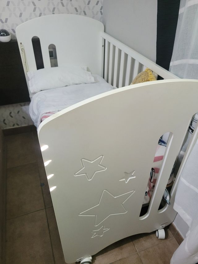 Detalles del productoCuna colecho modelo New Star de Don Algodón, con barreras para poder usarla de las 2 maneras. Tiene diferentes alturas. Está en buen estado, pero tiene una rueda que en ocasiones se mueve y por una parte la madera se ha roto (por eso se ha bajado el precio). Se puede recoger desde ya.