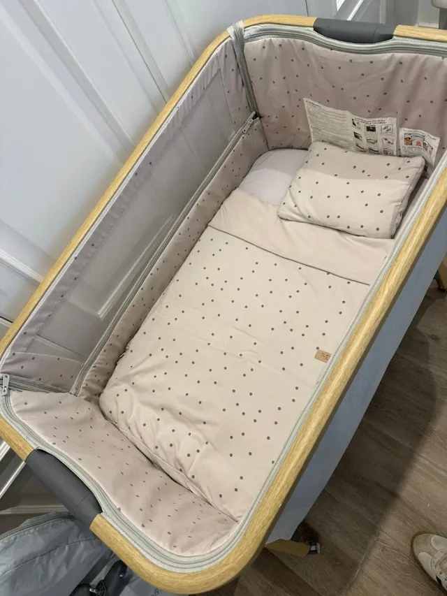 Se entrega con colchon y almohada y vestiduras originales + cojín antivuelco de la marca Petite Marmotte + 5 sábanas bajeras + 1 protector de colchón de rizo + 2 juegos de sábana y funda de cojín.