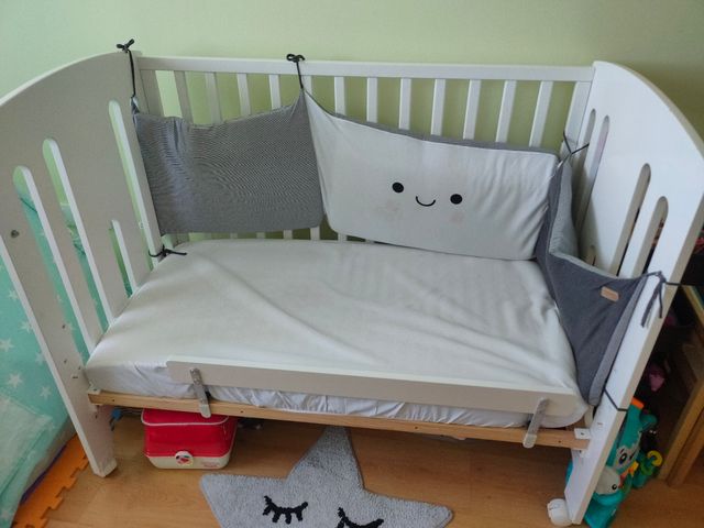 Detalles del productoVendo cuna colecho con barrera que se pone y se quita, o se queda a media altura (en la foto está sin ella a modo de cama normal). El somier se puede colocar en diferentes alturas para ajustar a medida que va creciendo. Tiene ruedas. Sólo tiene unos picotazos en un lateral (ver en foto). La vendo con la barrera de Ikea, el colchón (de muy buena calidad) y la chichonera.