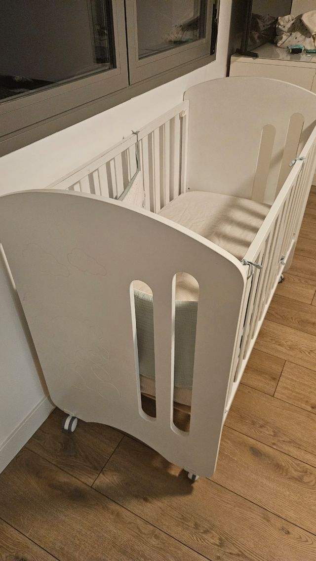 Cuna colecho Aloha en color blanco. Diseño moderno y funcional. - Estructura de madera. - Ruedas para facilitar el movimiento. - Incluye colchón.
